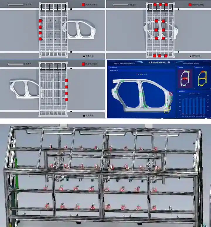 如左图所示,冲压线尾AI缺陷检测系统由封闭检测环境(不影响现有产线结构)、算力中心及电气控制、人机交互平台展示等相关的硬件组成。